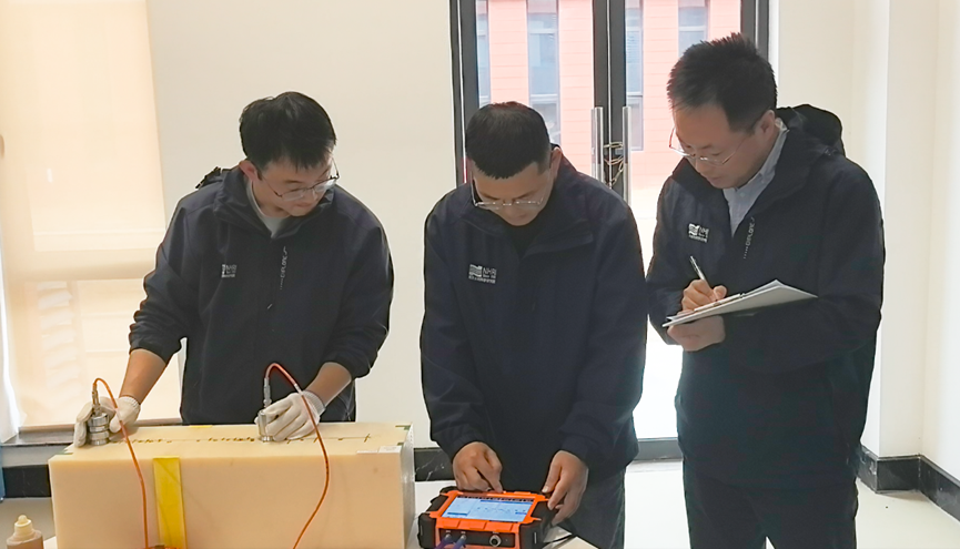 考核现场,我院检测人员沉着应战、规范操作。从试验环境确认、仪器声速标定到跨缝测试、数据采集与分析,全过程严格遵循规程要求。在省级交通主管部门的现场监督见证下,团队以零失误、全规范的专业表现,按时高质量完成全部试验流程并提交数据报告,充分展现了我院检测人员扎实的业务功底与严谨的工作作风。