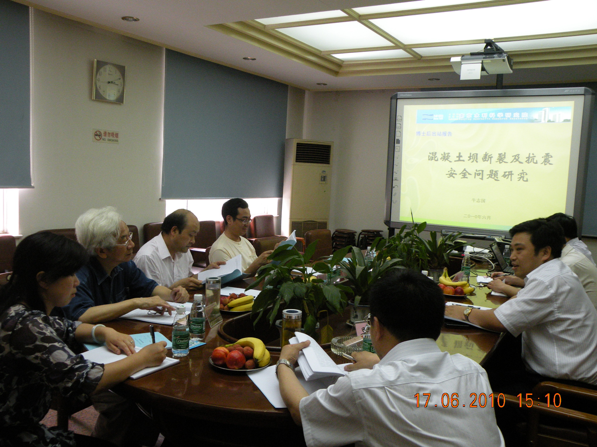 牛志国博士后出站报告评审会于2010年6月17日下午在南京水利科学研究院材结所会议室举行。由河海大学蔡 新教授、张燎军教授,南京航空航天大学赵新铭教授、南京水利科学研究院洪晓林教授、胡少伟教授组成了评审专家组。