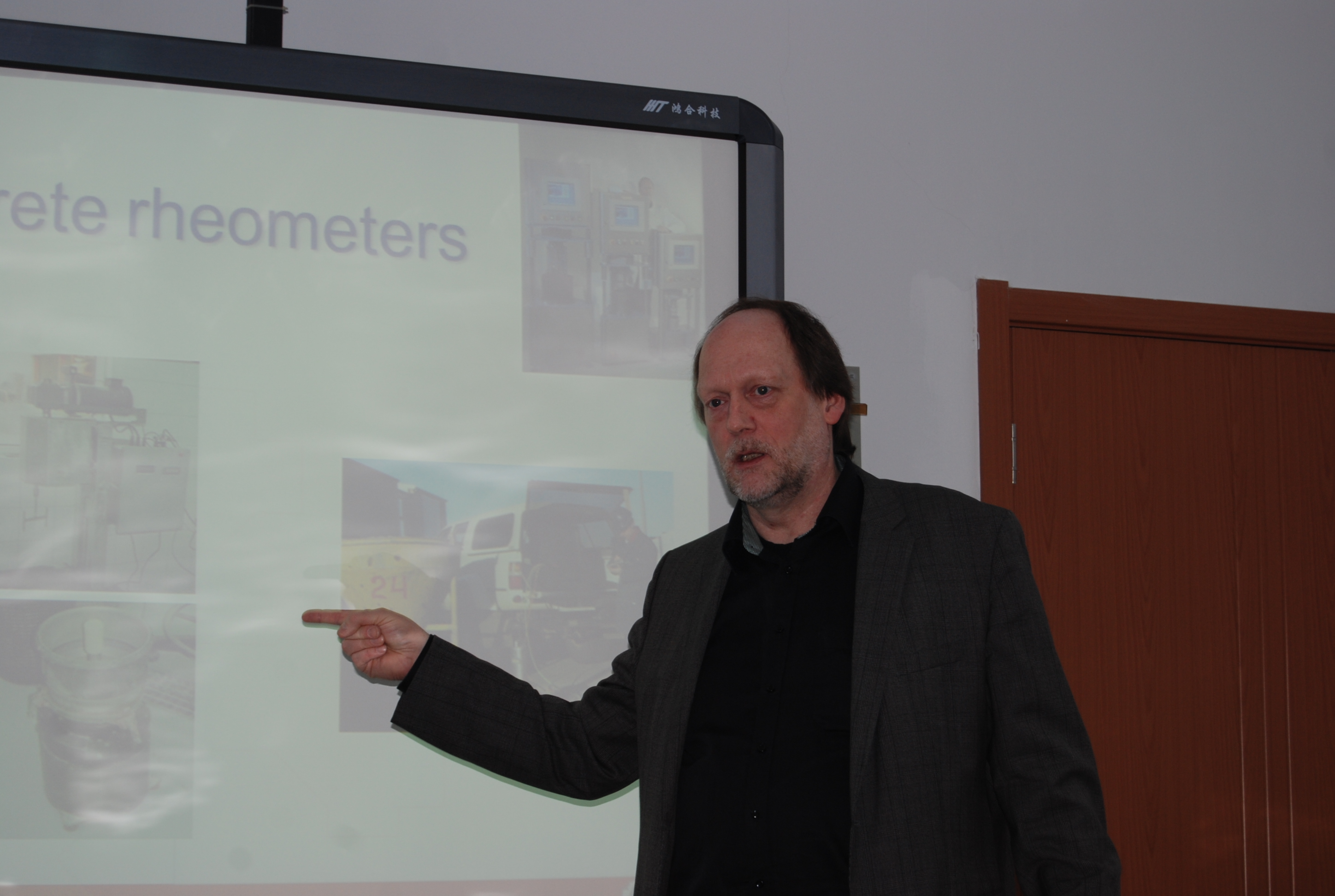 3月1日,Wallevik教授先在我所会议室介绍了流变学在混凝土中的应用,然后再到铁心桥材料试验室对流变仪整体结构和软件使用进行了现场培训,用砂浆对流变学参数测量进行了实地的演示。3月2日,针对40mm骨料混凝土进行Coplate模式测试,选用已有的配合比拌制混凝土,坍落度130mm,测试结果良好;又采用不同的搅拌叶片及外筒针对标准砂浆和20mm骨料大流动度混凝土进行试验。试验结果符合预期效果,表明该流变仪可对净浆、砂浆、混凝土等各种流态物质进行流变学参数测试,试验精度高,可重复性好。
