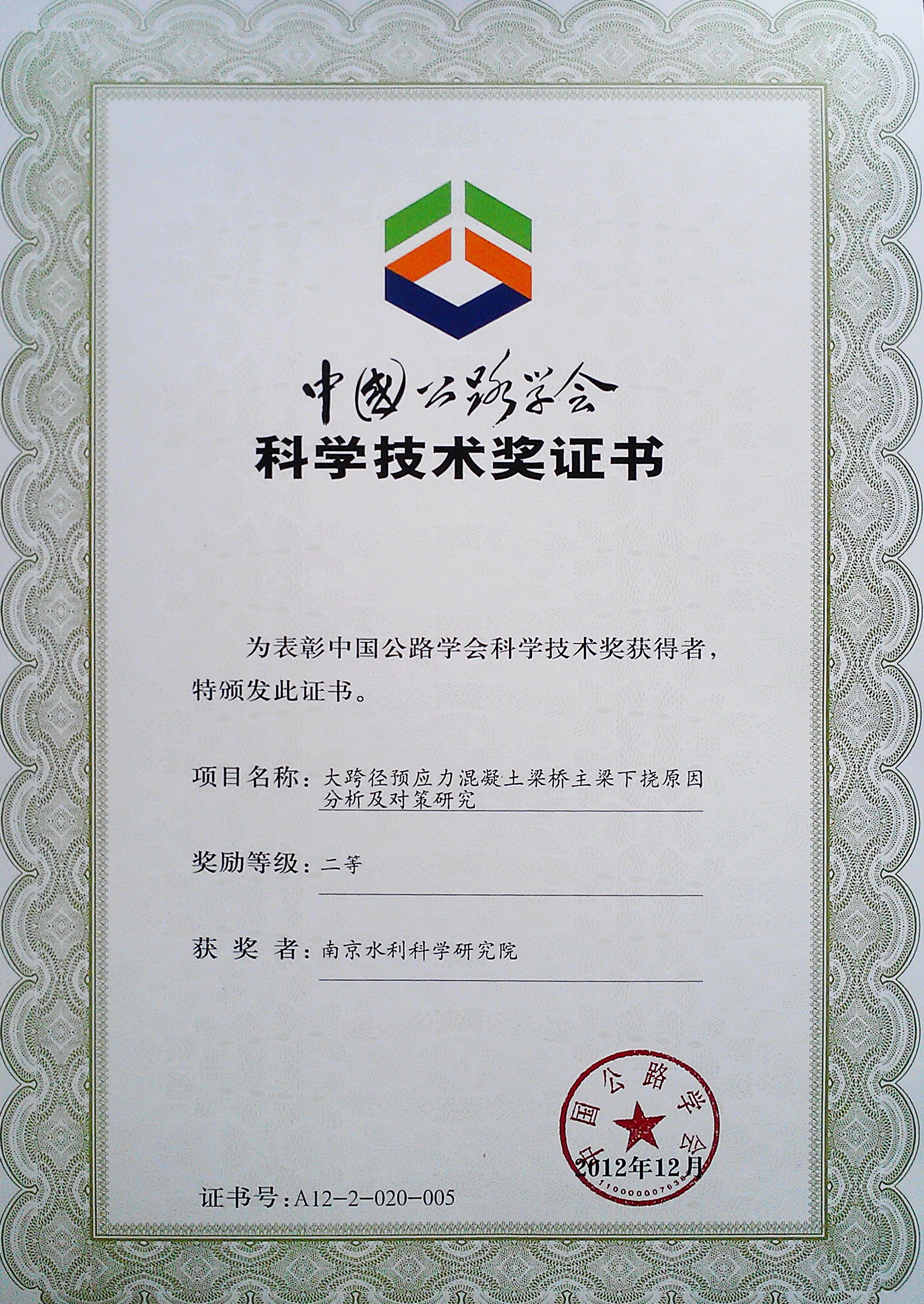2013年2月由交通运输部公路科学研究院、南京水利科学研究院、长沙理工大学、长安大学、广西壮族自治区交通规划勘察设计研究院、广西壮族自治区公路管理局等共同完成的交通运输部西部交通科技项目《大跨径预应力混凝土梁桥主梁下挠原因及对策研究》(200631822327)获得2012年中国公路学会科学技术进步二等奖。该项目以大跨径预应力混凝土连续箱梁桥的持续过度下挠问题为研究对象,通过大规模的桥梁下挠状况调查、模型试验和理论分析,从下挠特征、桥用高强混凝土材料特性、反复荷载作用效应、长期挠度计算与设计方法、施工方法与工艺、防控主梁过度下挠措施和已下挠预应力梁桥处治技术等七大方面对大跨径预应力混凝土梁桥的下挠问题进行了研究。该项目成果已于2011年12月通过了交通运输部验收和鉴定。