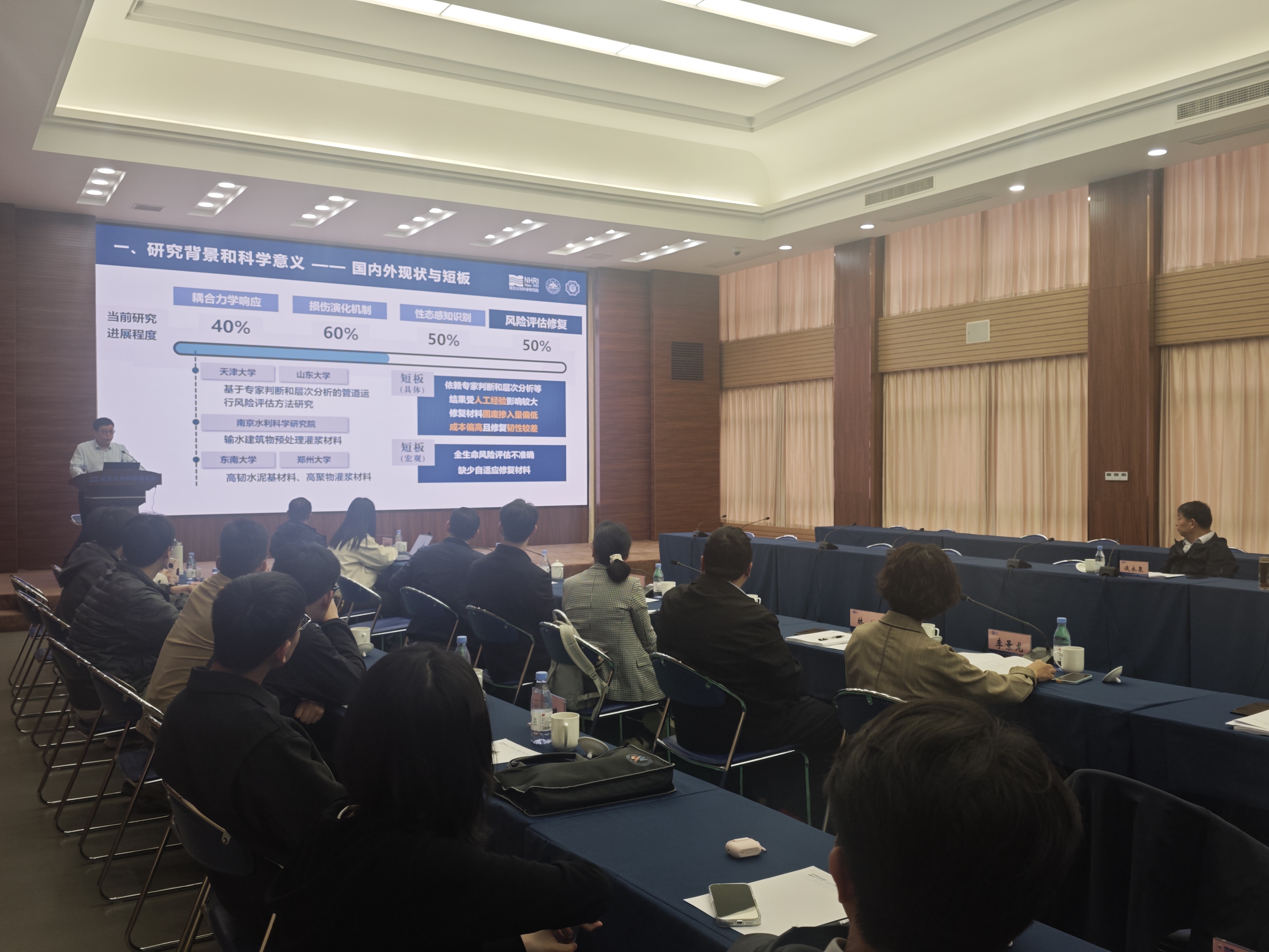 项目负责人、我院材料结构研究所陆俊正高就项目实施方案进行汇报,包括:项目立项背景与研究现状、核心技术与创新增量、实施路线与任务分配、研究内容及实施方案、进度计划与考核节点、研发团队及工作基础等。就突破PCCP“流-固-基”耦合力学模型及地质灾害动态影响机制、断丝、渗漏及腐蚀渐进破坏规律及结构损伤演化特征、PCCP服役全要素性态精准感知与病害智能识别方法及全生命周期风险评估与自适应修复、韧性提升技术等任务研究给出具体研究方案与实施方法。